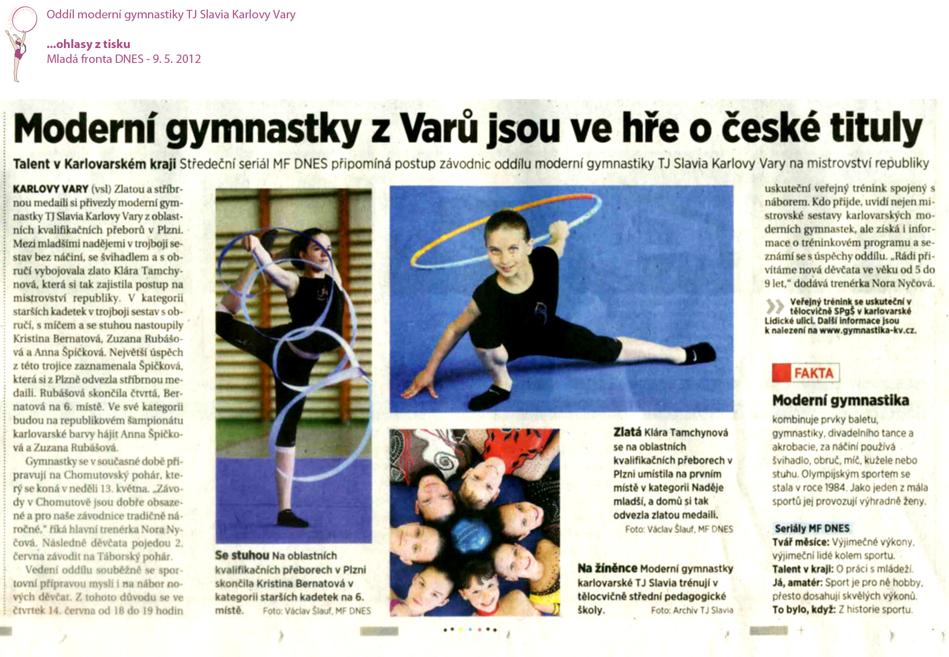 Výsledky oddílu moderní gymnastiky, oddílu TJ Slavia Karlovy Vary, jsou dlouhodobě na solidní úrovni a proto neujdou ani pozornosti tištěných médií či jiných zpravodajství. Je nám ctí, že se můžeme temito ohlasy pochlubit.