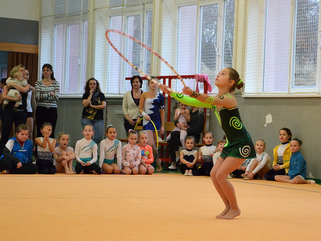 Po skončení kategorie 0. předvedly ještě dvě gymnastky dovednosti v základním programu kategorie II. (ročník 2003 – 2004) v sestavě s obručí.