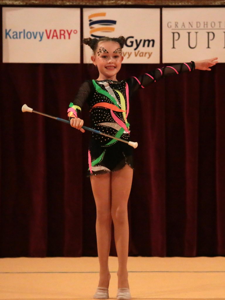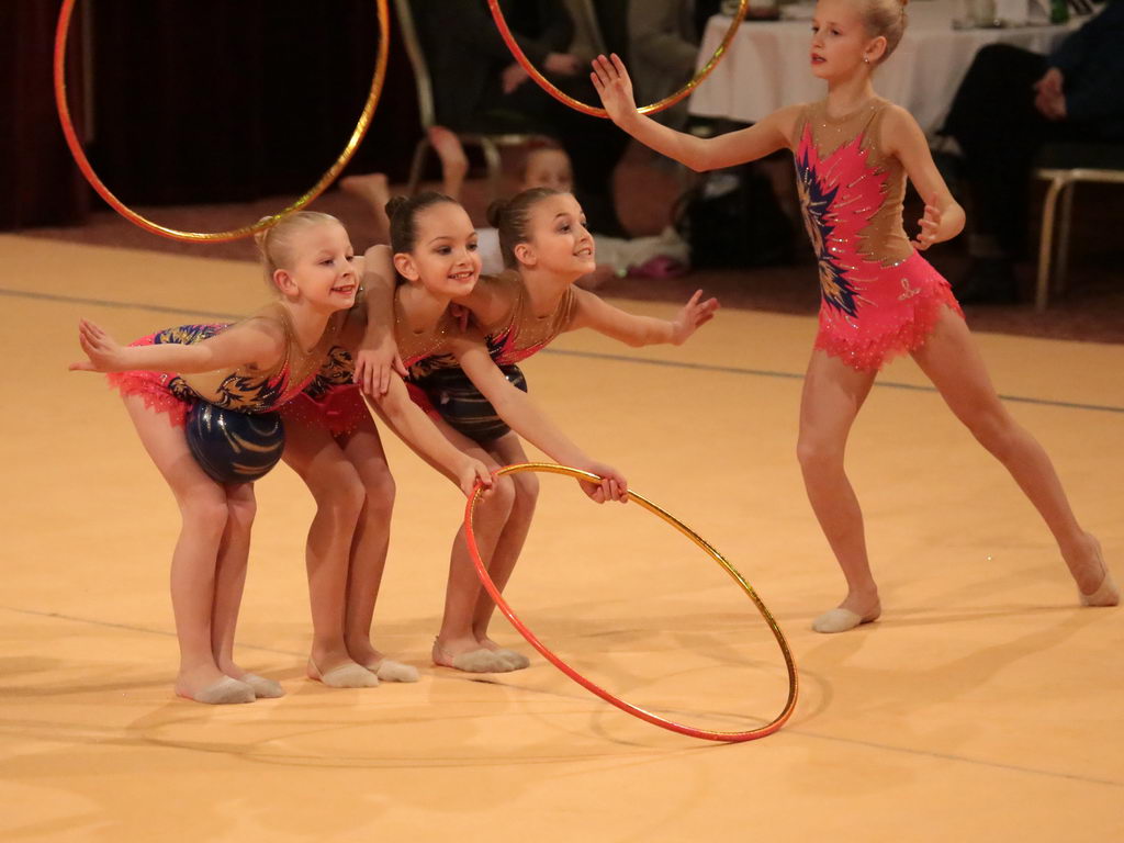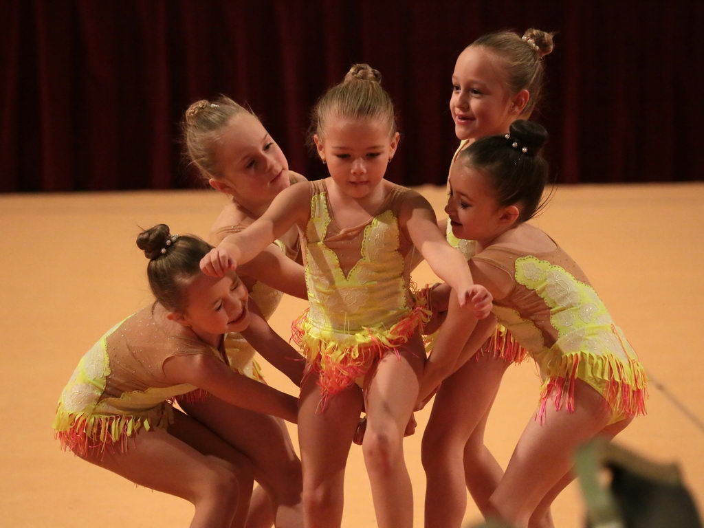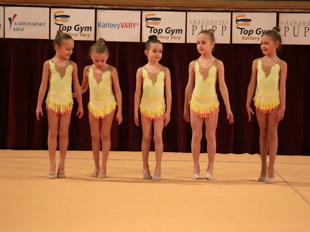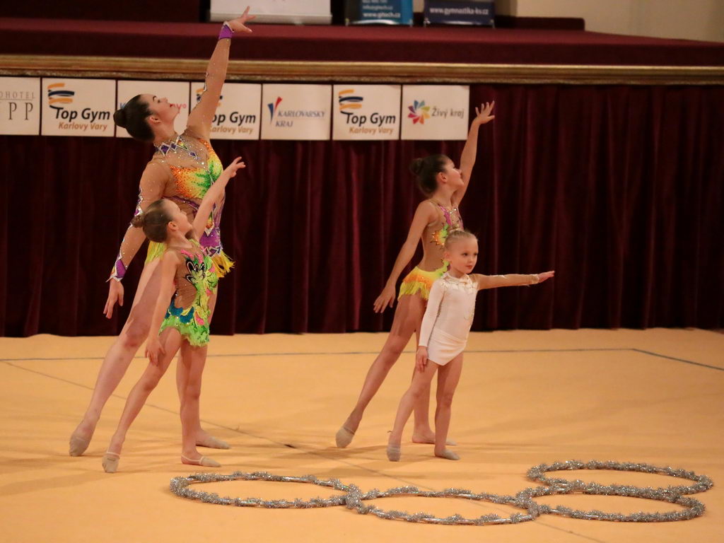 Pomyslné třešničky na už tak krásný dort vánoční exhibice zasadily naše gymnastky se závodními skupinovými sestavami nadějí nejmladších bez náčiní (Michaela Borovičková, Laura Kopfstein, Barbora Kuklišová, Darja Kulagina a Melinda Plzáková) a nadějí mladších s dvěma míči a třemi obručemi (Darja Fedunova, Nikol Fukarová, Klára Orlová, Klára Pelíšková a Tereza Soumarová).