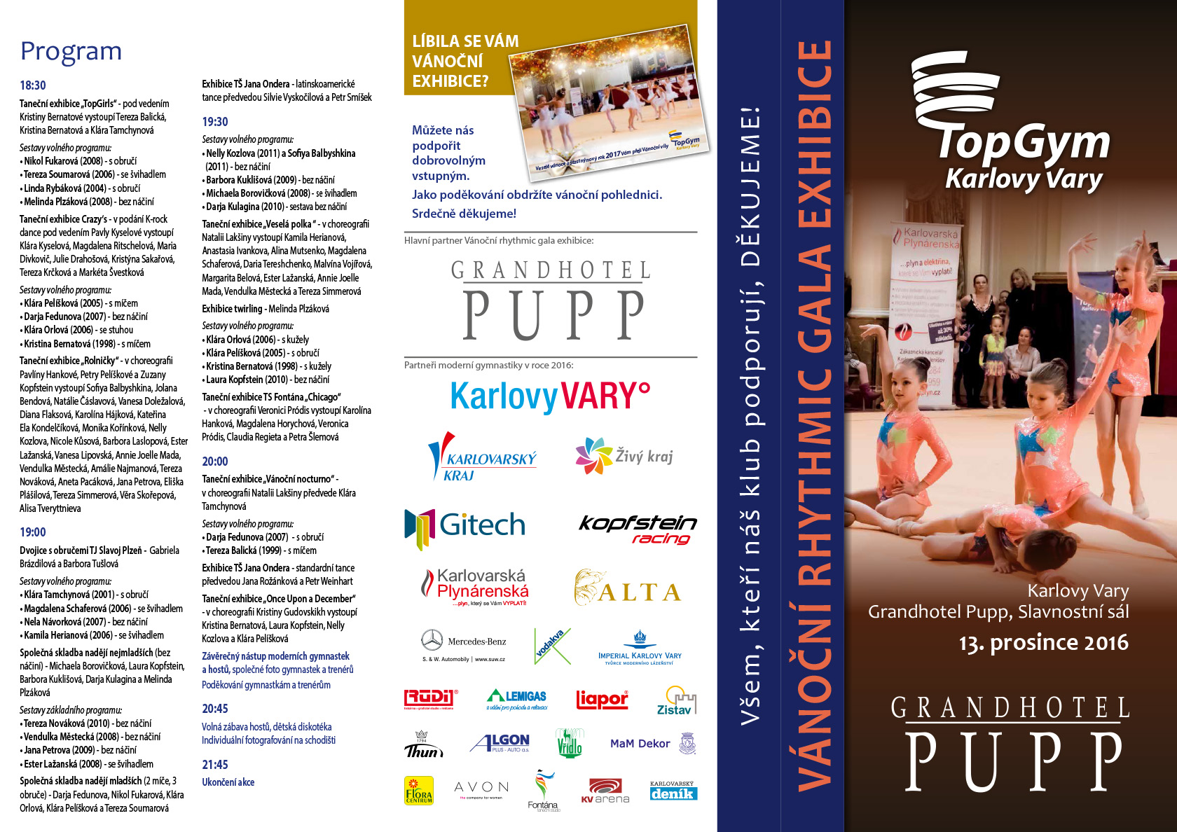 Navázali jsme na loňský úspěch a vánoční exhibici jsme díky partnerství s Grandhotelem Pupp opět uskutečnili v prostorách, které více než důstojně podtrhly krásu moderní gymnastiky. Diváci z řad rodičů, příbuzných a dalších příznivců elegance pohybu shlédli celkem 39 vystoupení. V těch se střídaly sestavy moderní gymnastiky a taneční exhibice našich děvčat a pozvaných hostů.