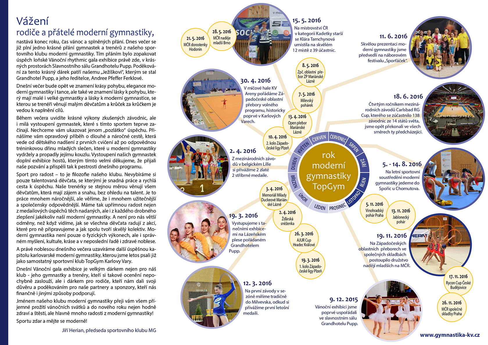 To, že byla Vánoční exhibice vyvrcholením náročné celoroční práce, si mohli diváci prohlédnout v programu exhibice na „časové“ ose akcí, kde je 24 různých závodů a dalších akcí, kterých se naše gymnastky zúčastnily. A o tom, že tato náročná práce pod vedením hlavní trenérky Miroslavy Špičkové má výsledky i pozitivní ohlasy, svědčí mimo jiné i účast pozvaných hostů z oblasti politického i veřejného života. Těmi byli Markéta Wernerová - poslankyně Parlamentu České republiky, Jana Vildumetzová - hejtmanka Karlovarského kraje, Jiří Klsák a Michal Riško - náměstci primátora Staturárního města Karlovy Vary, Maria Semenova - tajemnice konzula Ruské federace v Karlových Varech, Maxim Sherman – vedoucí Izraelského zastoupení v Karlových Varech, Jitka Peřina - předsedkyně Sportovní unie Karlovarska, Václav Sebera - předseda sportovní komise města Karlovy Vary, Petr Kopfstein - čtyřnásobný mistr světa v letecké akrobacii a pilot seriálu RedBull AirRace v kategorii Master, Jan Onder - taneční mistr a Blanka Mlejnková - předsedkyně Českého svazu moderní gymnastiky. Účast takovýchto hostů v předvánočním nabitém čase i jejich slova upřímné chvály jsou pro nás velkou poctou a my jim tímto děkujeme.