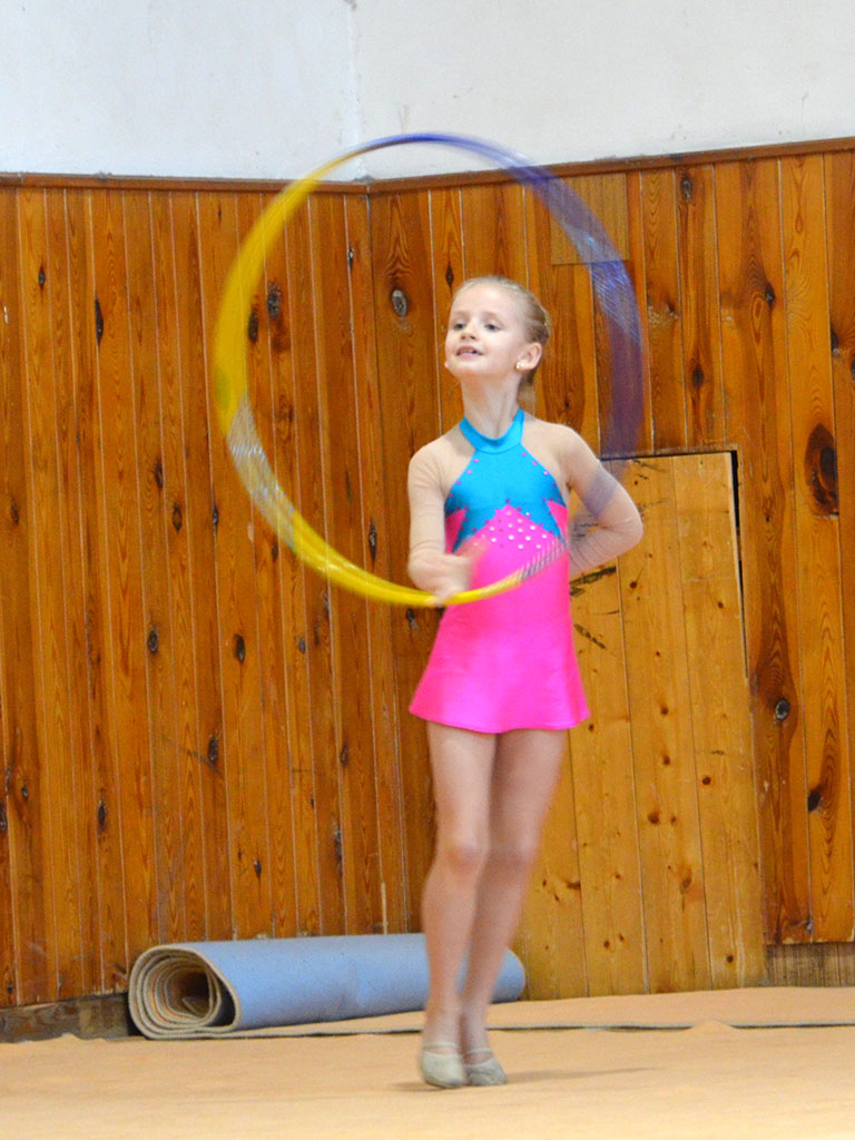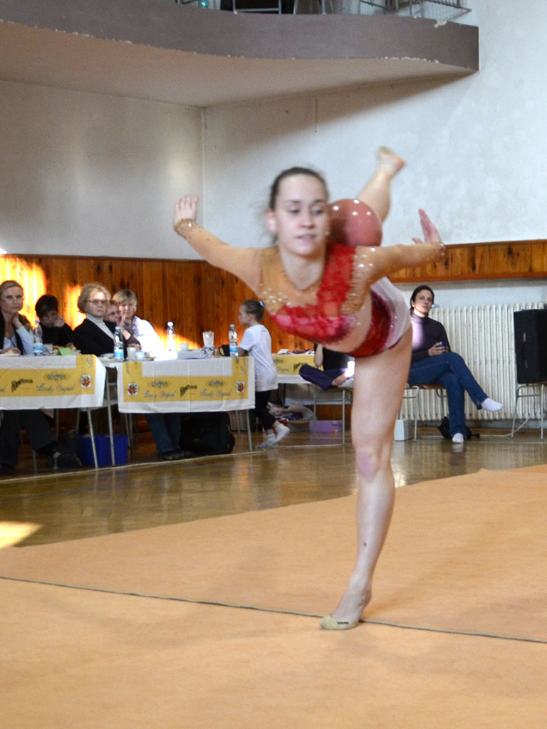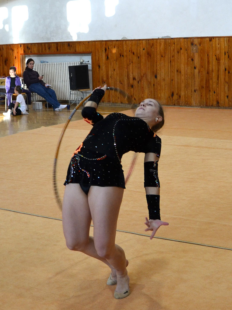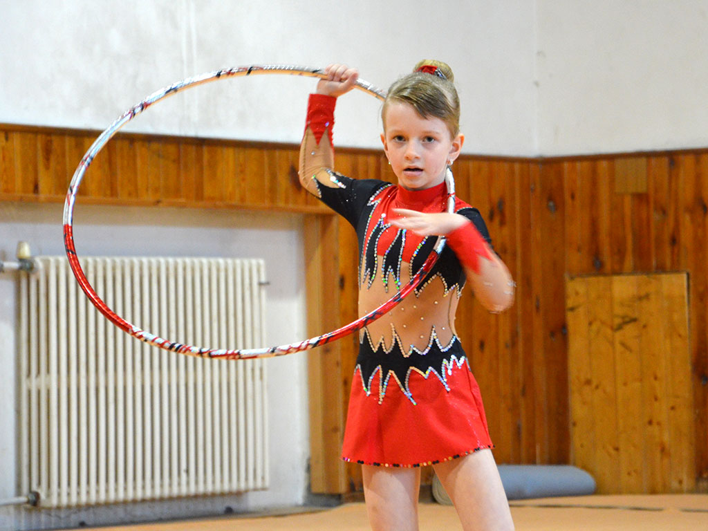 Naše nejmladší závodnice Klára Svobodová svou obruč jede závod od závodu lépe, jen tentokrát zapracovaly nervíky a let náčiní přes plochu a následná ztráta koncentrace se bohužel odrazily i na známce. Druhou sestavu již zajela velmi pěkně, má krásné dopnuté nárty, a když se zadaří, tak i krásný úsměv. Jen tak dále!